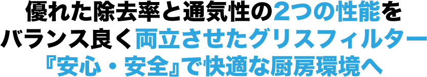 特殊耐熱ステンレス繊維を増量し、フィルター全体にむらなく均一にすることで広い面積で効果的に油脂分を除去( 除去率91% 以上)フィルターに蓄積する油脂分が少ないので、性能を長期間維持します。